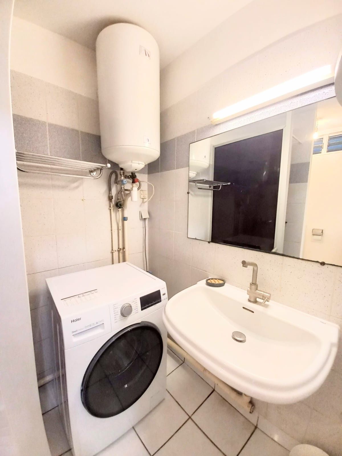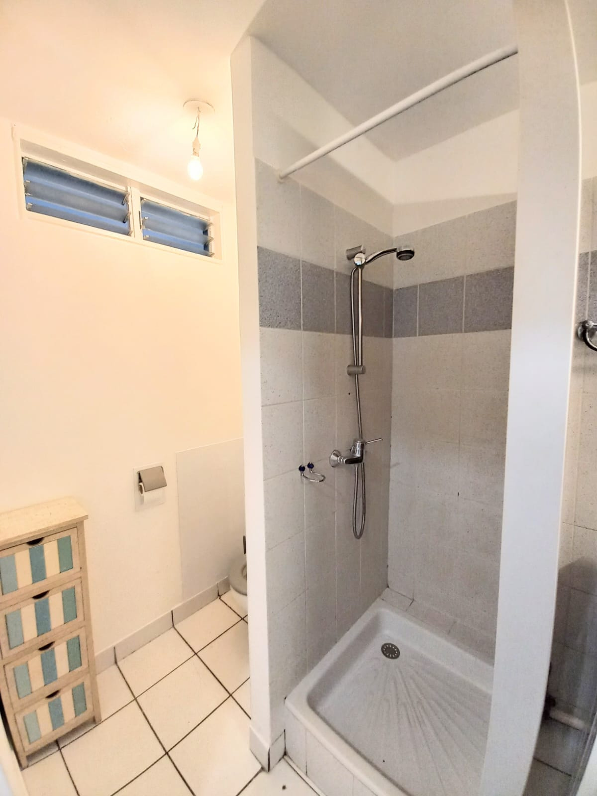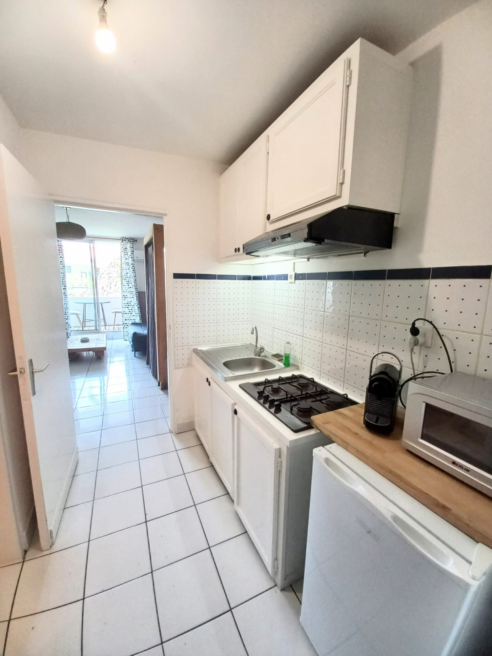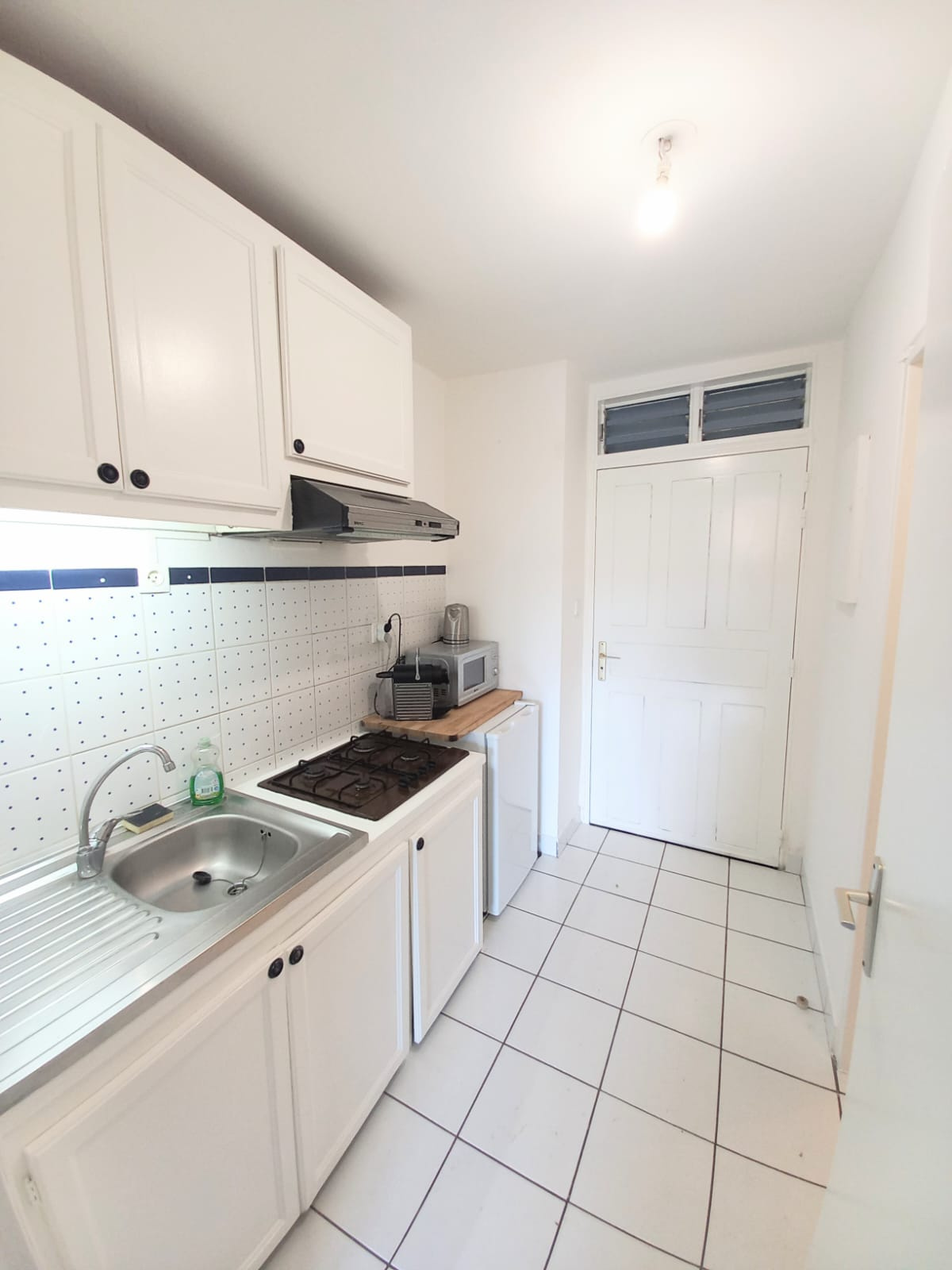 Vous entrez par ma petite cuisine fonctionnelle, suivie de ma salle d'eau avec wc, équipée d'un lave linge.