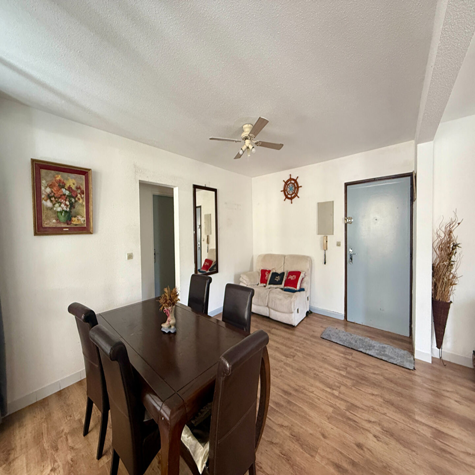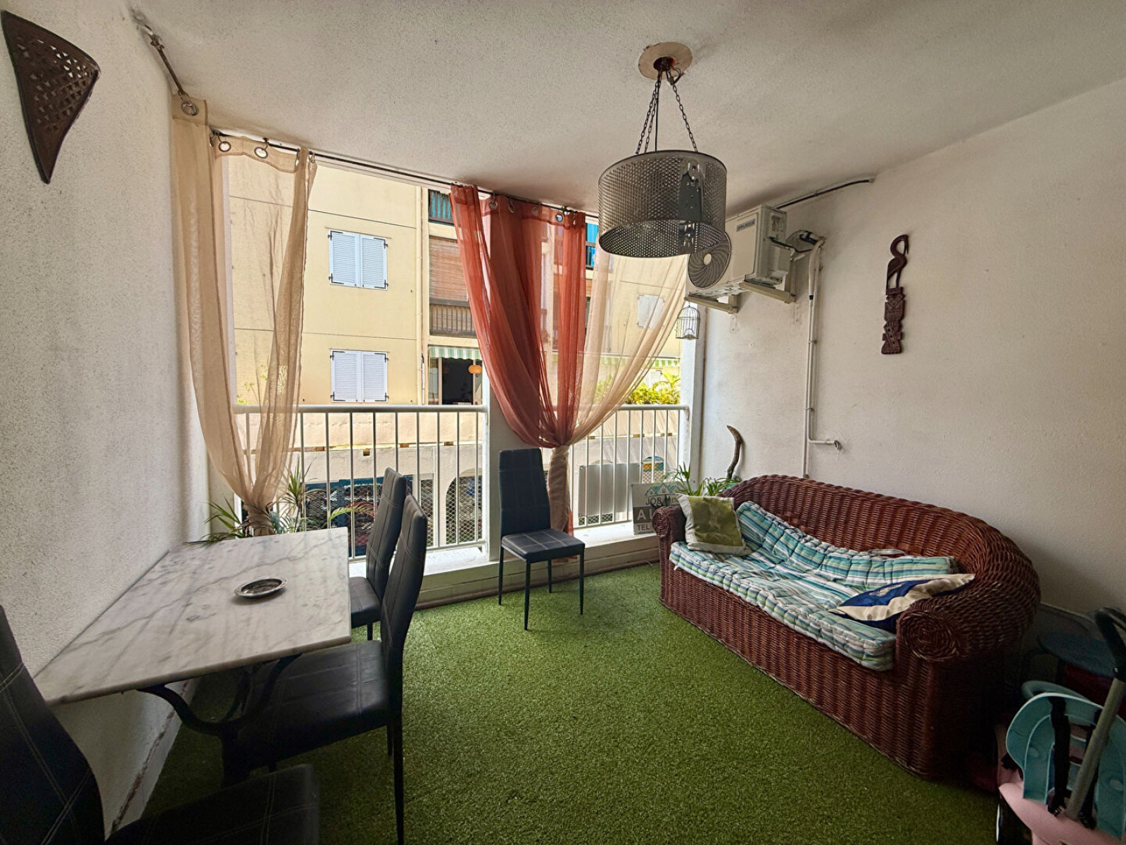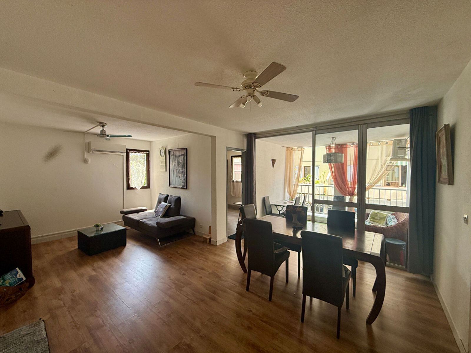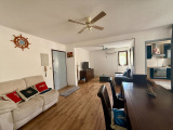 À l'intérieur, je me présente comme un ancien T3 transformé en T2 pour vous offrir un vaste séjour. J'ai aussi une cuisine indépendante, une varangue où savourer vos instants de détente, une chambre avec placard, une salle d'eau, des WC séparés, et bien sûr le confort moderne avec climatisation et brasseurs d'air dans le séjour comme dans la chambre.