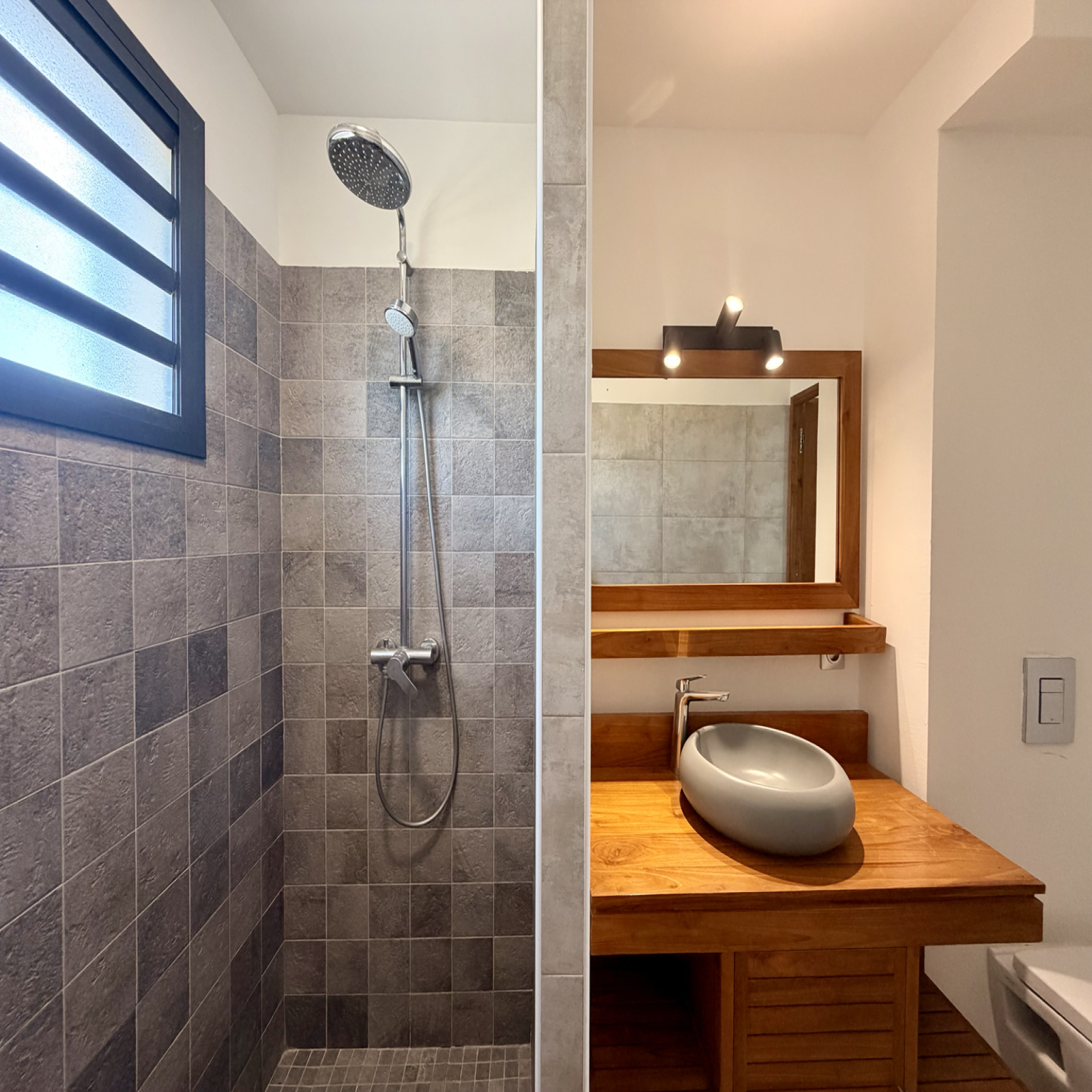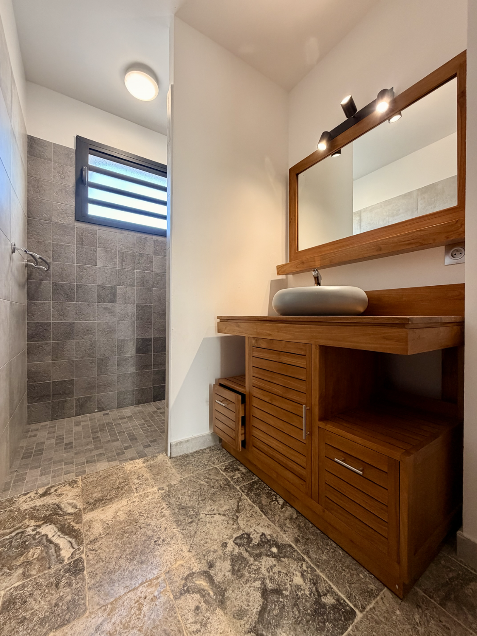 - 2 salles d’eau modernes avec des matériaux nobles (teck, travertin)