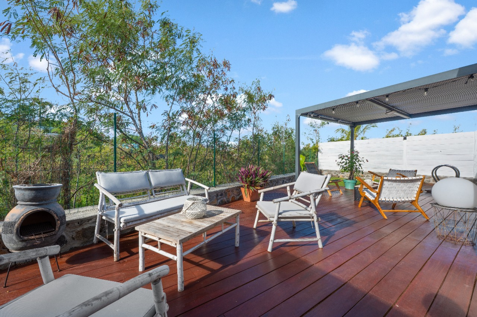 Descriptif: - 4 chambres lumineuses , dont 2 vous offrent une belle vue mer, toutes équipées de grands dressings. - 2 salles d eau modernes et équipées en meubles teck, travertin - Très grande terrasse en bois exotique en cumaru pour profiter de la vue imprenable sur la ravine - une Piscine de 4x2,5. 2 places de parking sécurisées équipées d'une borne de recharge électrique.Un havre de paix!