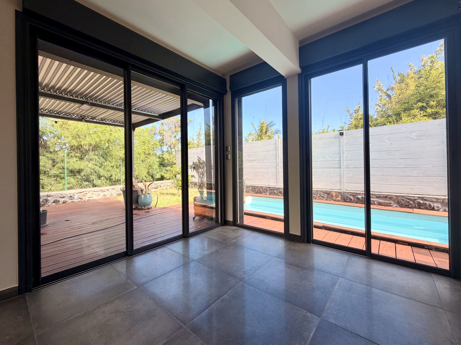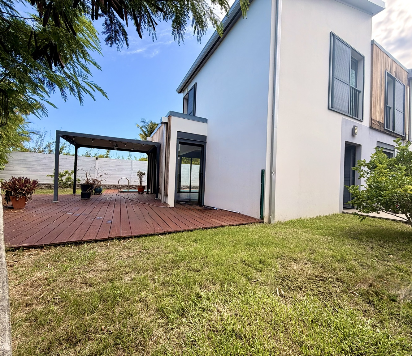 - Une très grande terrasse en bois exotique (cumaru), idéale pour profiter d’une vue apaisante sur la ravine